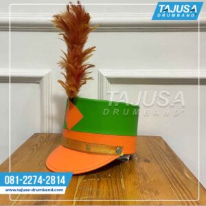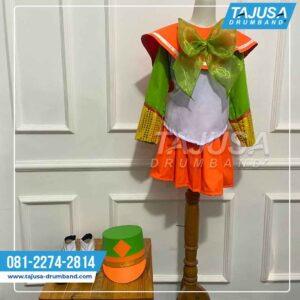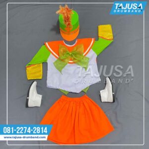 Set perempuan pada foto menampilkan tampilan manis dan mencolok. Topi pasukan hijau-oranye dengan bulu oranye memberi kesan anggun sekaligus kuat. Atasan berwarna putih dengan kombinasi hijau dan oranye, serta pita organza besar berwarna hijau, menonjolkan ciri busana drumband perempuan. Payet kuning emas pada lengan memantulkan cahaya dan menghasilkan kilau menarik. Rok oranye yang mengembang mendukung gerakan anak selama koreografi drumband. Sepatu putih melengkapi penampilan agar terlihat rapi dan profesional.