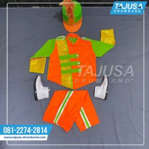 Set laki-laki pada foto tampil lebih tegas dengan dominasi warna oranye dan hijau neon. Atasan berkerah tegak menampilkan kesan formal. Garis hijau dan kancing dekoratif pada dada memperkuat unsur marching band. Payet kuning emas pada panel depan dan lengan menciptakan sentuhan mewah yang tetap selaras dengan set perempuan. Celana oranye dengan lis hijau-putih memperkuat kesan kompak. Sepatu putih menyempurnakan penampilan agar tampil harmonis.
