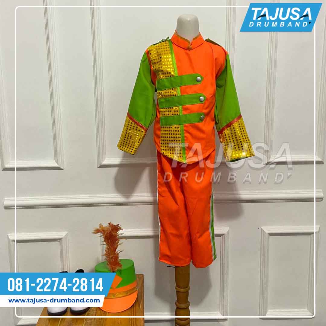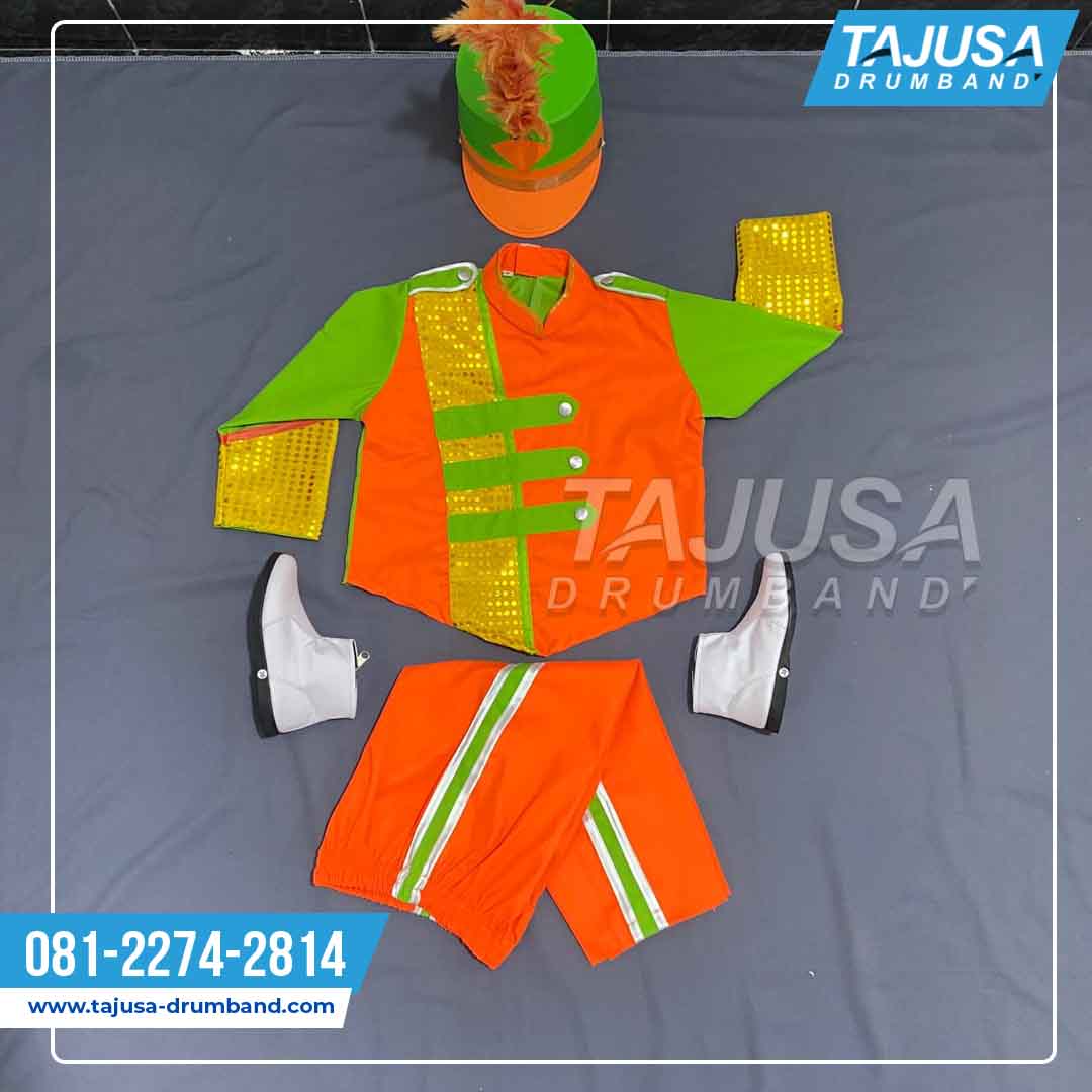 Set laki-laki pada foto tampil lebih tegas dengan dominasi warna oranye dan hijau neon. Atasan berkerah tegak menampilkan kesan formal. Garis hijau dan kancing dekoratif pada dada memperkuat unsur marching band. Payet kuning emas pada panel depan dan lengan menciptakan sentuhan mewah yang tetap selaras dengan set perempuan. Celana oranye dengan lis hijau-putih memperkuat kesan kompak. Sepatu putih menyempurnakan penampilan agar tampil harmonis.