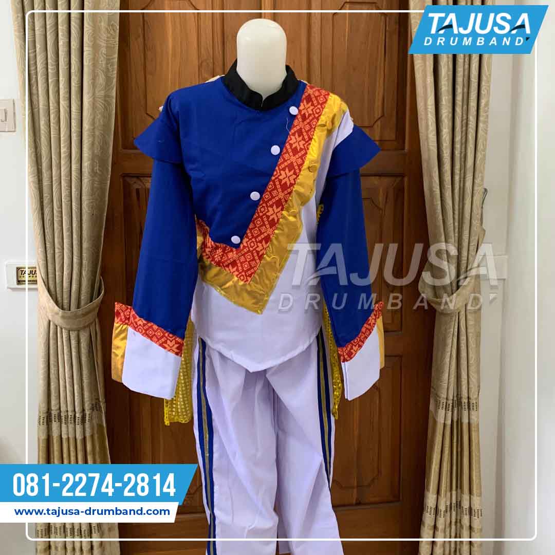 Detail seperti kancing putih dekoratif, hiasan pita emas, dan celana putih berlis biru memberikan kesan energik dan profesional. Tak heran, seragam ini cocok untuk tim sekolah, organisasi seni, hingga komunitas marching band yang ingin tampil berbeda dengan nuansa budaya lokal yang tetap modern.