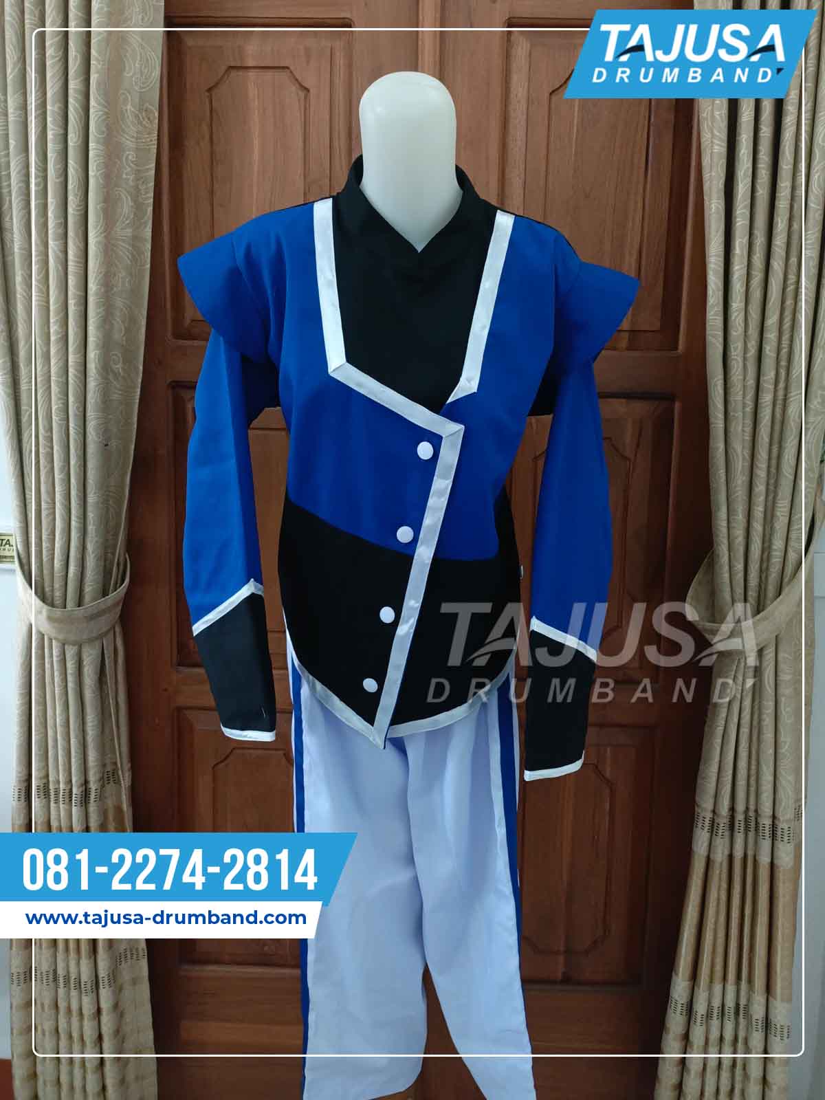 Tampil memukau di setiap parade dan pertunjukan dengan seragam drumband elegan ini. Dirancang dengan potongan asimetris yang modern, seragam ini menggabungkan warna biru royal yang kuat dengan sentuhan putih bersih, aksen emas mengkilap, serta motif kain merah etnik di bagian depan dan lengan. Selain itu, kerah hitam tegak menambah kesan formal dan tegas.