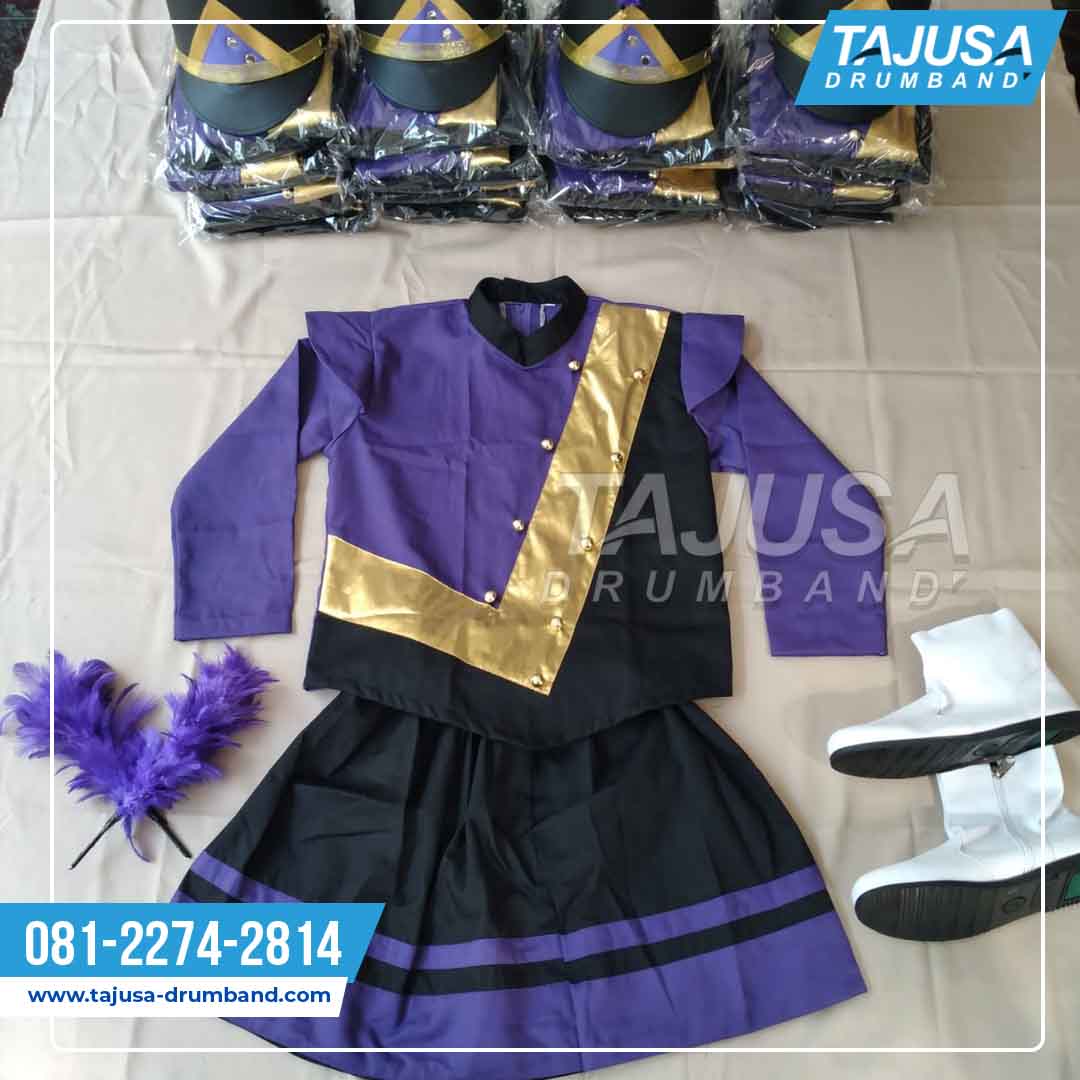 Baju drumband pada gambar ini menampilkan desain yang elegan dan penuh energi dengan kombinasi warna ungu, hitam, dan emas.