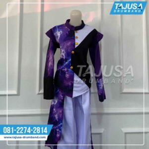 Tajusa menghadirkan baju marchingband motif petir ungu untuk menonjolkan kekuatan dan semangat tim. Kombinasi warna ungu tua, hitam, dan putih menciptakan tampilan berani sekaligus elegan. Sementara itu, motif petir menyala pada kain printing memberikan kesan dinamis dan penuh energi. Oleh karena itu, kostum ini sangat cocok untuk penampilan di panggung besar maupun parade malam.