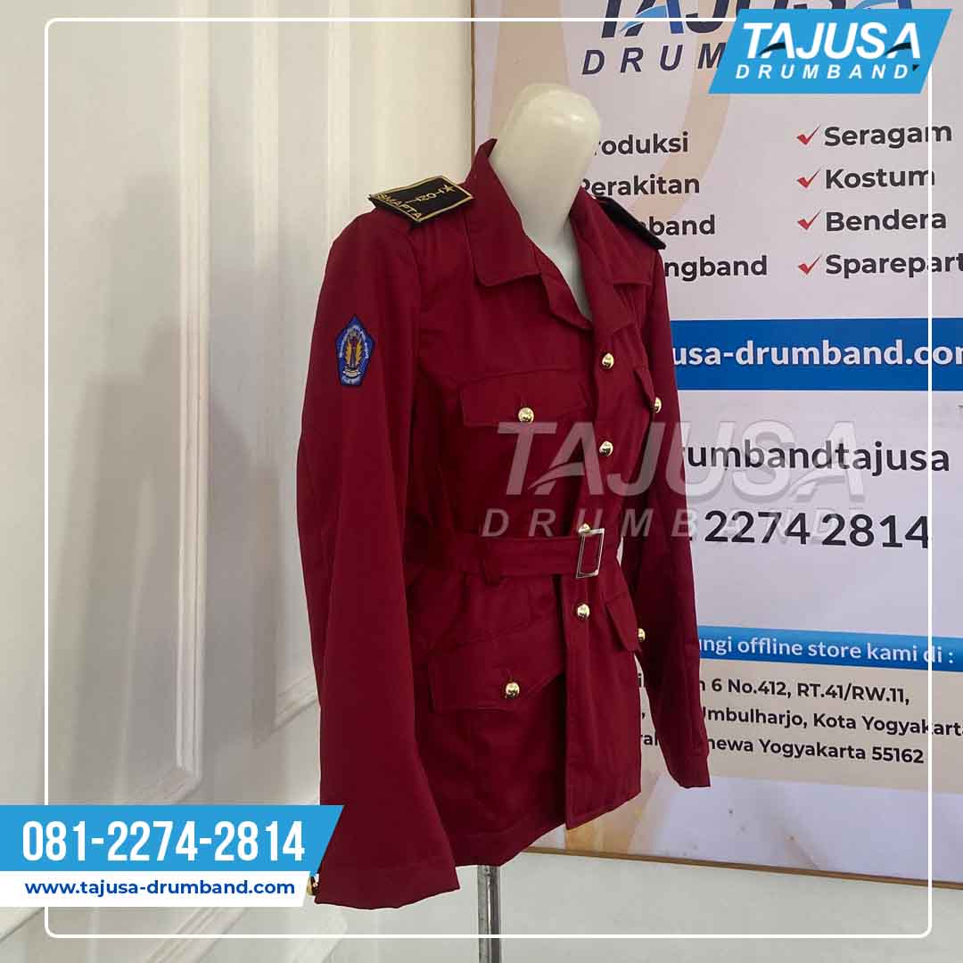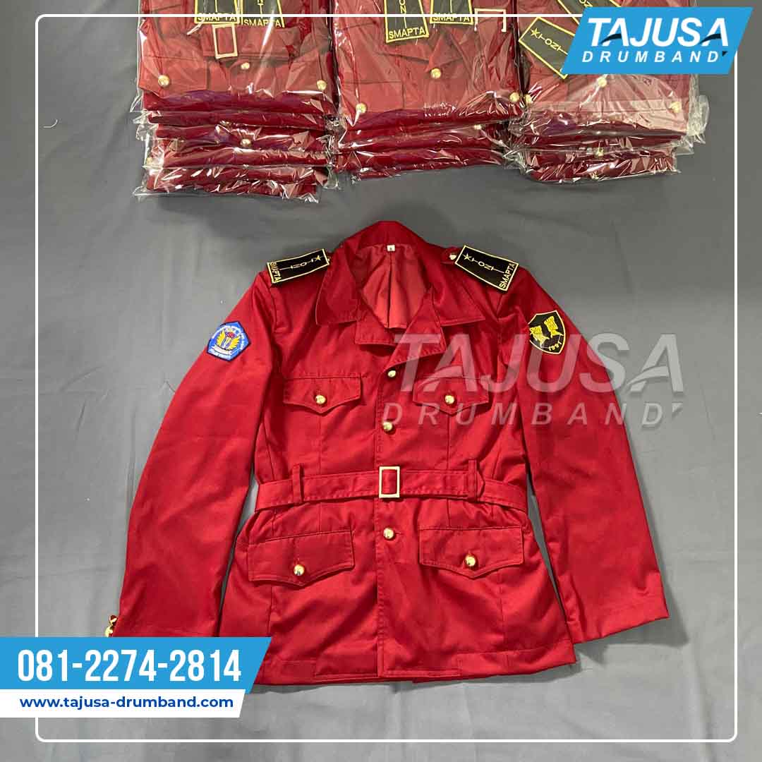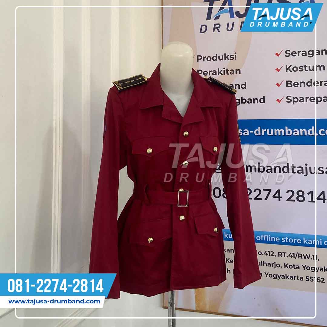 Dengan bahan yang kokoh dan desain yang elegan, seragam ini mendukung penampilan pasukan secara konsisten. Tampilan yang serasi, postur yang tegap, dan warna merah marun yang kuat membuat kesan barisan semakin berwibawa di mata penonton.