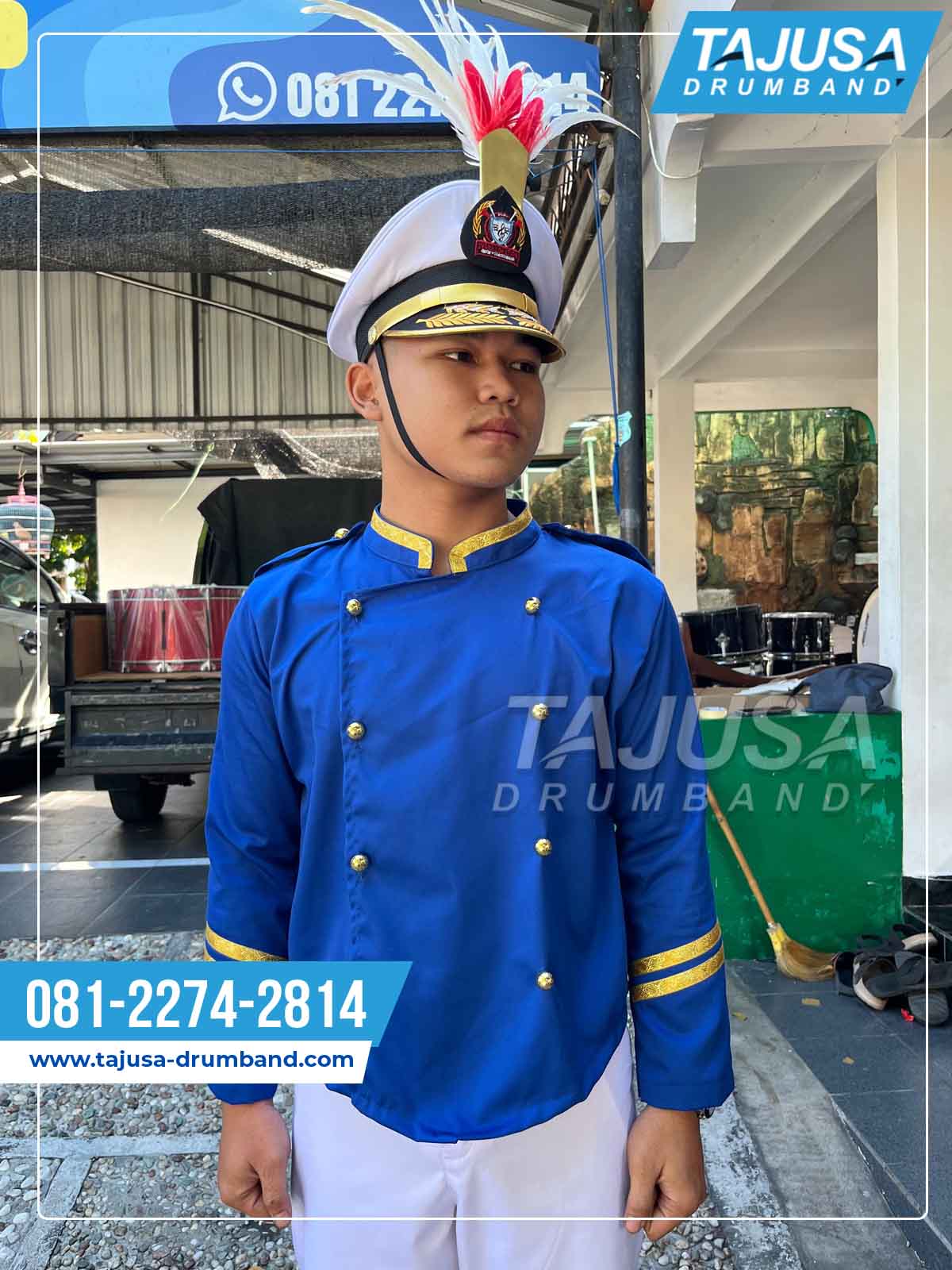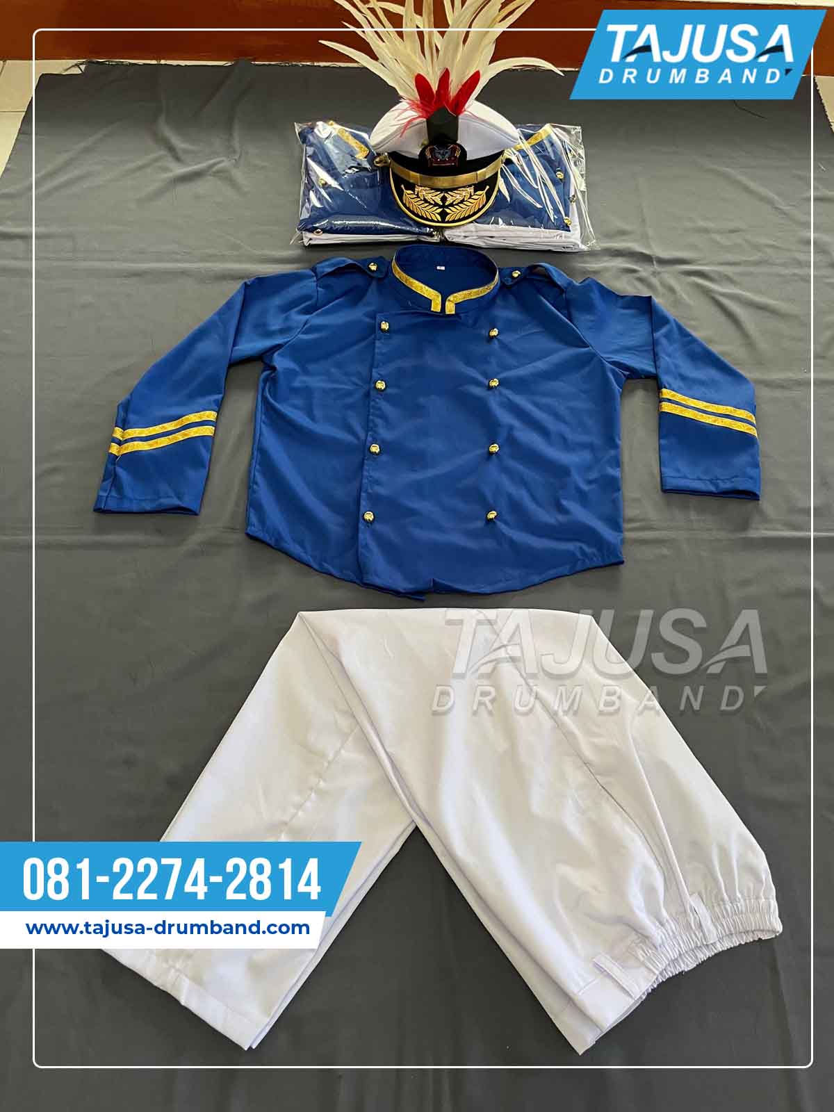 Atasan: Warna biru royal mencolok, lengan panjang dengan model double breasted, serta aksen emas di kerah dan pergelangan tangan. Selain itu, dua garis emas di lengan menambah kesan militeristik.
