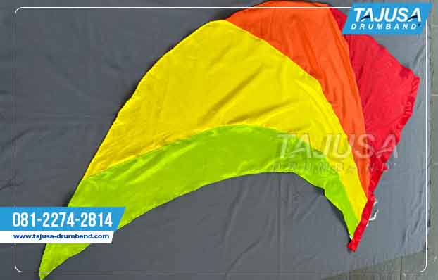 Desain bendera berbentuk menyerupai setengah elips ini tampil mencolok berkat gradasi warna merah, oranye, kuning, dan hijau stabilo. Karena menggunakan kain ringan dan mengilap, bendera ini memberikan efek gerak yang indah dan memikat saat dikibaskan. Tak heran, banyak tim colour guard memilih desain ini untuk pertunjukan yang mengutamakan daya tarik visual.