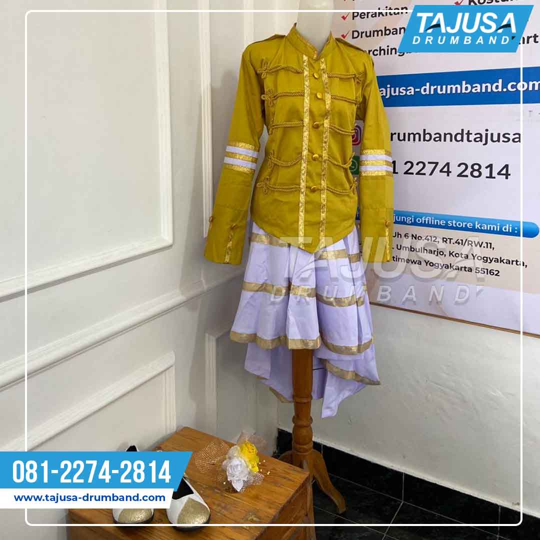 Desainer kostum Color Guard menciptakan kostum kuning lemon putih dengan memadukan estetika dan kenyamanan. Bagian atasan yang berwarna kuning lemon menarik perhatian karena kilau lembutnya di bawah sinar matahari. Sementara bagian bawah yang berwarna putih menciptakan keseimbangan visual, membuat setiap gerakan terlihat anggun dan jelas.