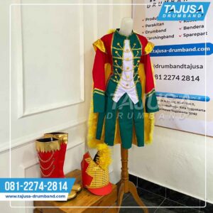 Berbeda dengan pasukan, kostum mayoret menonjolkan keanggunan dan kemewahan. Warna hijau, merah, dan emas tetap mendominasi agar selaras dengan pasukan, namun detailnya jauh lebih kaya. Di bagian dada, hiasan rantai emas dan kancing besar menghadirkan nuansa glamor dan berwibawa. Selanjutnya, potongan panjang di bagian belakang dengan kain kuning emas berkilau menciptakan efek dramatis setiap kali mayoret bergerak. Desain seperti ini membuat peran mayoret terlihat menonjol sebagai pemimpin barisan yang anggun, tegas, dan penuh kharisma. Karena itu, setiap langkahnya mampu memikat pandangan penonton.