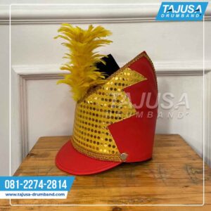 Kostum pasukan drumband pada foto ini memancarkan kesan gagah dan energik. Bagian atasan berwarna dasar hijau tua dengan aksen merah dan kuning emas menampilkan karakter tegas sekaligus ceria. Kemudian, potongan diagonal di bagian depan menambah nuansa dinamis, sementara garis emas di bagian lengan dan celana menonjolkan kesan rapi dan disiplin. Para pemain melengkapi penampilan mereka dengan sepatu putih bersih dan topi drumband putih berhias bulu kuning cerah. Perpaduan semua elemen ini membuat pasukan terlihat kompak, kuat, dan siap tampil percaya diri di hadapan penonton.
