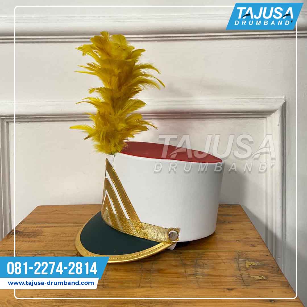 Kostum pasukan drumband pada foto ini memancarkan kesan gagah dan energik. Bagian atasan berwarna dasar hijau tua dengan aksen merah dan kuning emas menampilkan karakter tegas sekaligus ceria. Kemudian, potongan diagonal di bagian depan menambah nuansa dinamis, sementara garis emas di bagian lengan dan celana menonjolkan kesan rapi dan disiplin. Para pemain melengkapi penampilan mereka dengan sepatu putih bersih dan topi drumband putih berhias bulu kuning cerah. Perpaduan semua elemen ini membuat pasukan terlihat kompak, kuat, dan siap tampil percaya diri di hadapan penonton.