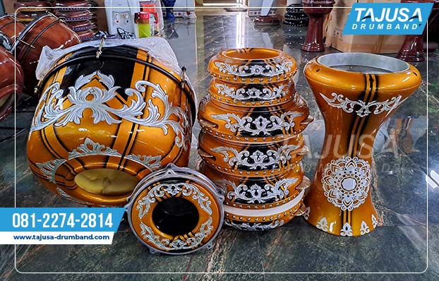 Tajusa Drumband juga menerima pemesanan satu set alat musik rebana secara custom jika Anda ingin menambahkan ukiran, corak, warna dan juga logo dari grup.