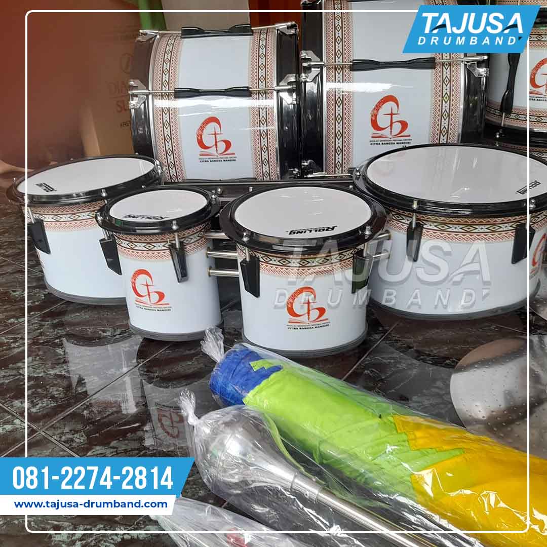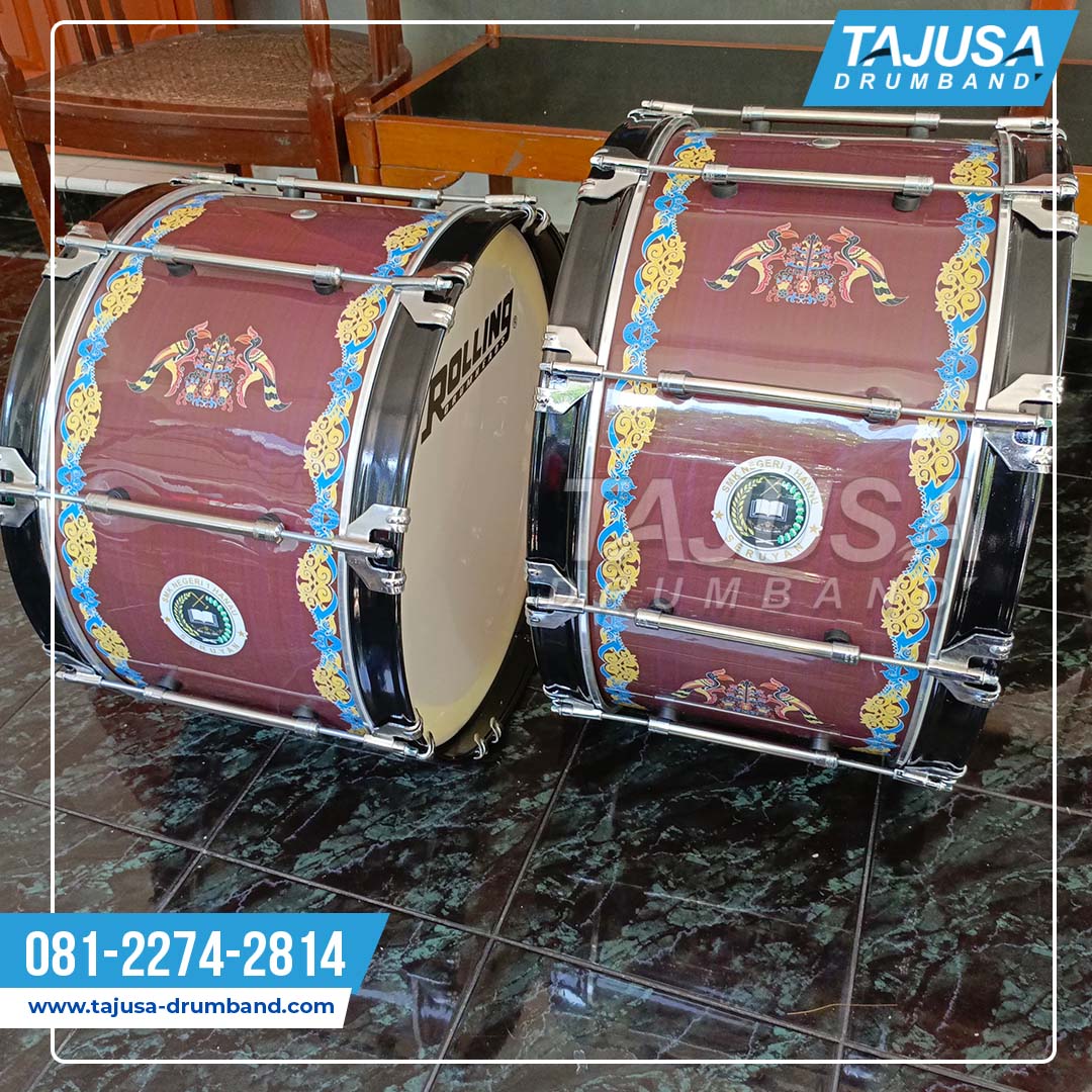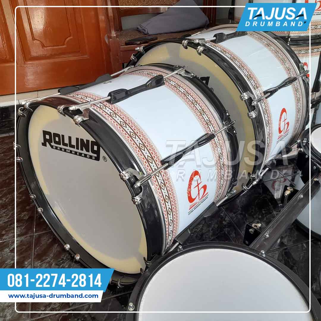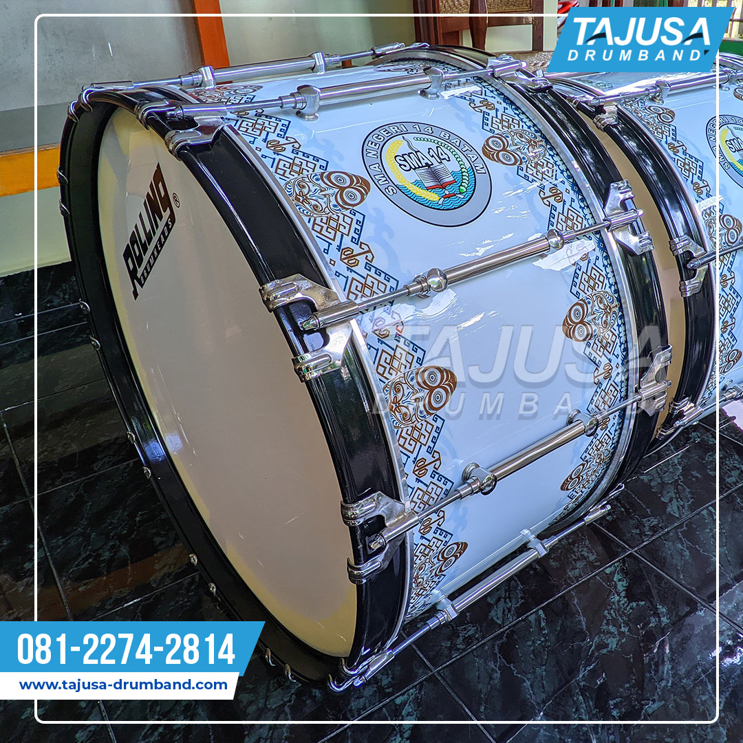 Drumband ini menampilkan desain unik yang memadukan kekuatan suara dengan sentuhan budaya Indonesia melalui motif batik yang elegan. Dengan demikian, dominasi warna putih bersih yang dipadu aksen garis batik berwarna cokelat di kedua sisi menciptakan tampilan modern namun tetap berakar pada tradisi. Pembuatannya menggunakan material berkualitas tinggi, sehingga bass drum ini menghasilkan dentuman yang dalam, bulat, dan bertenaga. Drum ini mengatur tempo utama dalam formasi drumband serta meningkatkan kesan profesional. Selain itu, produsen melengkapinya dengan head Rolling Drumheads yang terkenal tahan lama, sehingga pemain bisa mendapatkan performa maksimal dan kebanggaan visual di setiap pertunjukan.