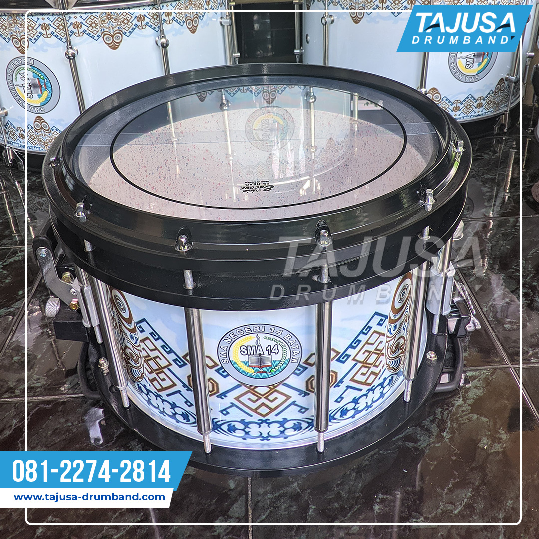 Snare HTS full colour ini menjadi salah satu instrumen unggulan untuk tim drumband SMA Negeri 14 Batam. Pengrajin membuat bodi dari bahan kuat dan ringan, lalu menambahkan desain grafis eksklusif bercorak etnik modern yang dipadukan dengan warna biru, putih, dan emas, sehingga tampilannya elegan sekaligus berkarakter. Tak hanya itu, head transparan dengan lapisan berkualitas tinggi mampu menghasilkan suara tajam dan bertenaga, sehingga pemain bisa memaksimalkan performa di parade maupun kompetisi. Sistem tuning presisi memudahkan pemain menyetel nada, sedangkan hardware kokoh membuatnya tahan di berbagai kondisi cuaca. Dengan begitu, snare ini menjadi simbol kebanggaan tim, bukan sekadar alat musik.