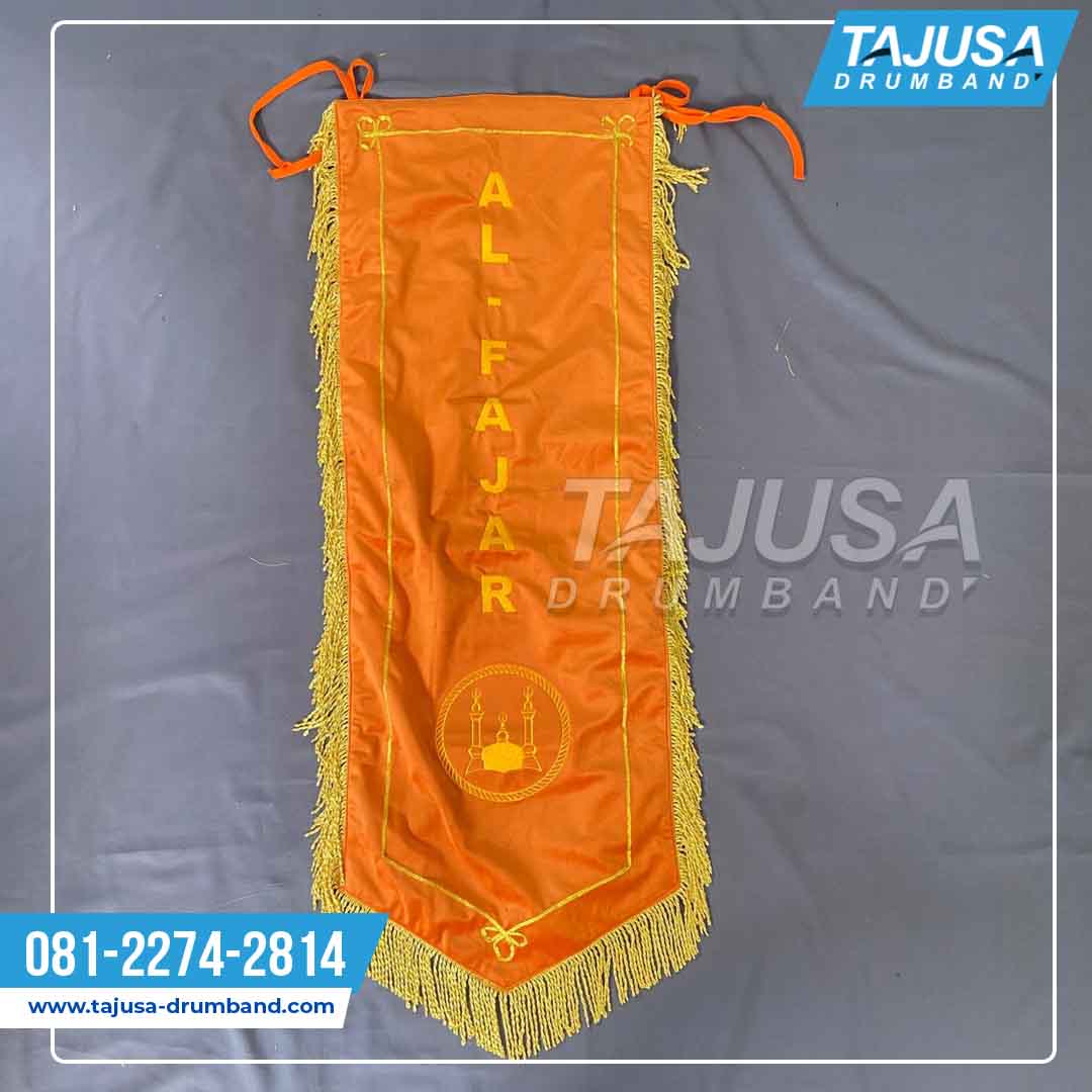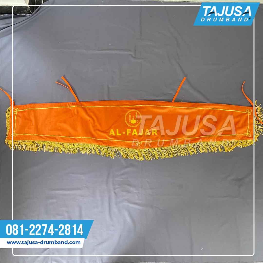 Vandel Drum Band AL-FAJAR ini dibuat dari bahan kain Belundru berwarna oranye cerah, dihias dengan bordir kuning yang rapi dan mencolok. Bagian pinggirnya dilengkapi rumbai benang warna emas yang memberikan kesan lebih mewah dan elegan.