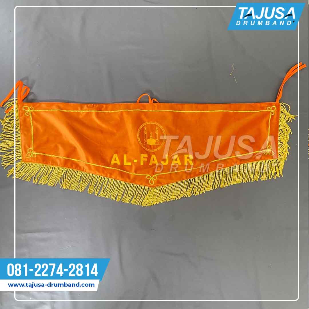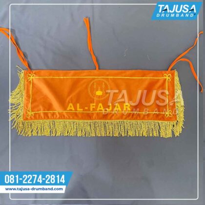 Di bagian tengah terdapat tulisan “AL-FAJAR” serta logo bergambar elemen musik/korps, dijahit dengan detail yang presisi. Produk ini dilengkapi tali pengikat di setiap sisi sehingga mudah dipasang pada alat drum band.