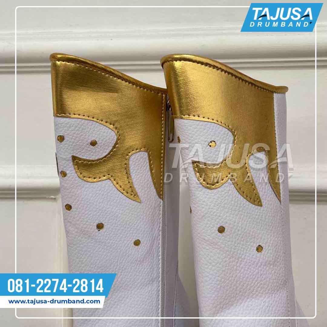 Detail ukiran emas yang artistik pada bagian shaft menjadikan sepatu ini terlihat unik, anggun, dan mudah serasi dengan berbagai desain kostum mayoret atau marching band.
