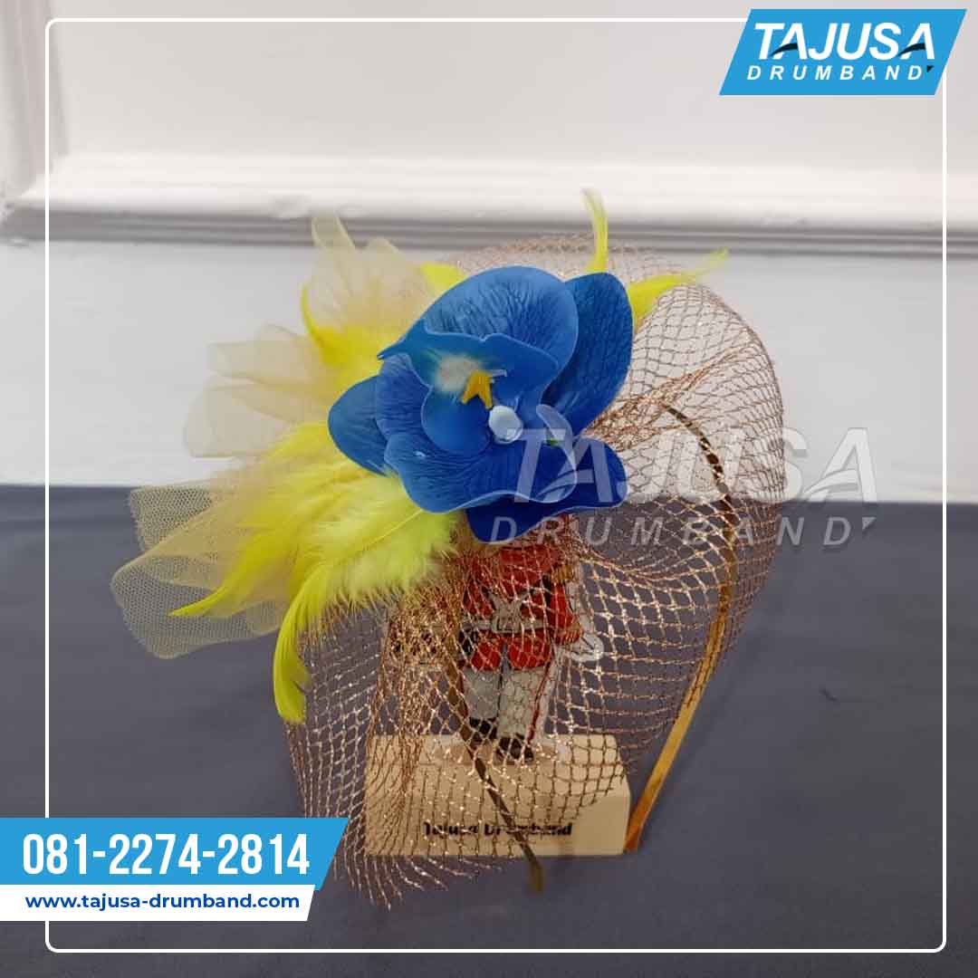 Headpiece drumband ini tampil dengan desain yang anggun dan mencolok, memadukan warna biru elektrik dan kuning cerah yang mencerminkan semangat, keceriaan, serta energi khas tim color guard. Elemen utama berupa bunga biru besar dari bahan sintetis menjadi pusat perhatian, dikelilingi bulu kuning lembut dan lapisan tulle emas yang memberi kesan mewah serta dinamis.