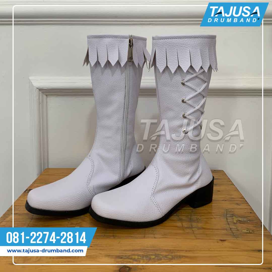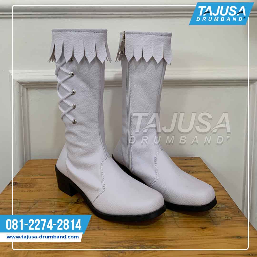Bagian atas sepatu dilengkapi dengan potongan rumbai segitiga yang khas, memberikan kesan tegas dan dinamis. Desain lace-up di sisi luar menambah sentuhan dekoratif sekaligus membantu menyesuaikan kenyamanan pemakaian. Sol hitam yang kokoh dan anti-slip memberikan pijakan stabil, sangat ideal untuk kegiatan baris-berbaris maupun atraksi panggung.