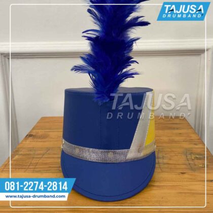 Topi Drumband Biru Kuning dengan Aksen Bulu Biru
