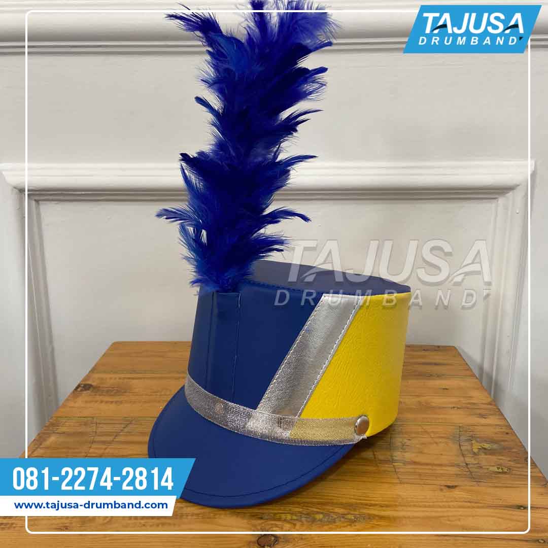 Topi Drumband Biru Kuning dengan Aksen Bulu Biru