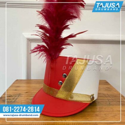 Topi drumband ini tampil dengan kombinasi warna merah, putih, dan emas yang memberikan kesan gagah, cerah, dan berwibawa. Warna merah yang dominan menggambarkan semangat dan keberanian, sementara sentuhan putih menambah kesan bersih dan rapi. Aksen emas yang melintang di bagian depan dan melingkari pinggiran topi memberikan nuansa mewah dan elegan, menjadikannya pusat perhatian dalam setiap penampilan.