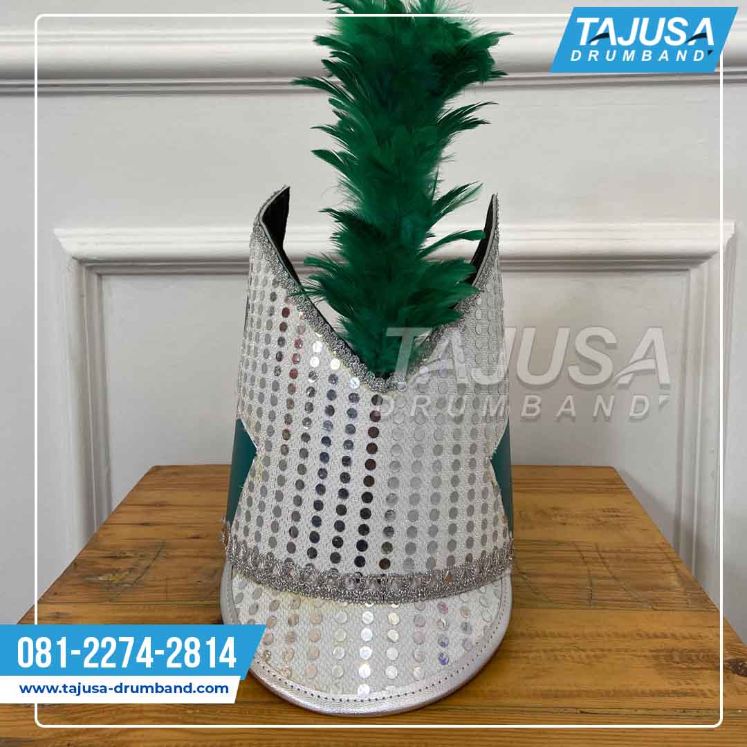Topi mayoret ini menghadirkan desain elegan dengan kombinasi warna hijau dan aksen silver berkilau. Dihiasi payet yang memantulkan cahaya, topi ini semakin mencuri perhatian saat dipakai di lapangan. Bagian atas dilengkapi dengan bulu hijau menjulang yang menambah kesan gagah sekaligus mewah. Cocok digunakan untuk penampilan mayoret, drumband, maupun marching band yang ingin tampil kompak, energik, dan penuh gaya.