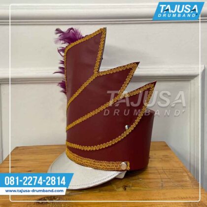 Topi pasukan ini menampilkan desain menjulang berbentuk sayap yang khas, memberikan kesan gagah dan berwibawa di barisan drumband. Warna maroon elegan dipadukan dengan ornamen asesoris emas yang melingkar rapi, menambah nuansa mewah dan profesional. Bagian bawah berwarna putih memberikan keseimbangan visual yang lembut, sementara hiasan bulu ungu di bagian belakang menjadi sentuhan akhir yang menawan.