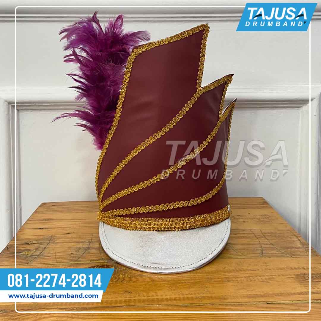 Topi pasukan ini menampilkan desain menjulang berbentuk sayap yang khas, memberikan kesan gagah dan berwibawa di barisan drumband. Warna maroon elegan dipadukan dengan ornamen asesoris emas yang melingkar rapi, menambah nuansa mewah dan profesional. Bagian bawah berwarna putih memberikan keseimbangan visual yang lembut, sementara hiasan bulu ungu di bagian belakang menjadi sentuhan akhir yang menawan.
