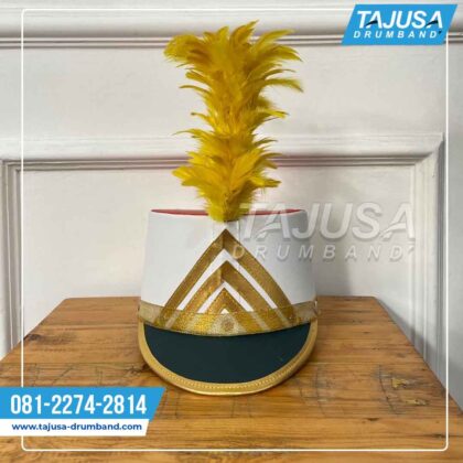 Topi pasukan ini memadukan warna putih, emas, dan hijau tua dengan sentuhan bulu kuning cerah di bagian atas, menciptakan tampilan yang berani dan elegan. Desain garis segitiga emas di bagian depan menambah kesan tegas dan berwibawa, mencerminkan semangat disiplin dalam setiap langkah pasukan drumband. Dengan bahan kokoh dan detail rapi, topi ini tidak hanya tampil menawan, tetapi juga nyaman digunakan dalam berbagai pertunjukan.