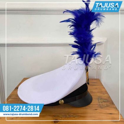 Topi drumband ini dirancang untuk memberikan tampilan elegan dan tegas saat parade maupun kompetisi. Dengan warna dasar putih dan hiasan bulu biru mencolok, topi ini memberi kesan anggun dan berwibawa bagi setiap pemain.