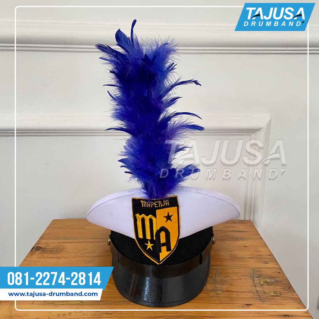 Topi drumband ini dirancang untuk memberikan tampilan elegan dan tegas saat parade maupun kompetisi. Dengan warna dasar putih dan hiasan bulu biru mencolok, topi ini memberi kesan anggun dan berwibawa bagi setiap pemain.