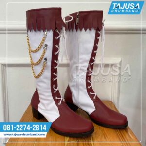 Setiap desain sepatu mayoret menghadirkan cerita visual tersendiri. Model merah marun dan putih memancarkan semangat juang dan ketegasan. Aksen rantai emas dan rumbai di bagian atas menambah kesan mewah, menjadikannya pilihan ideal untuk tim yang ingin tampil gagah dan berani.