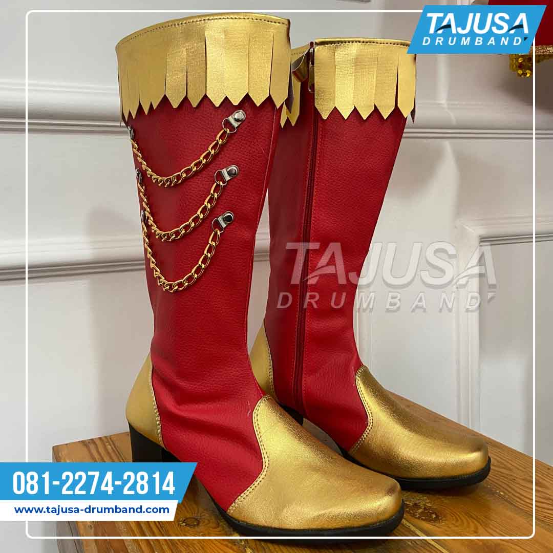 Setiap desain sepatu mayoret menghadirkan cerita visual tersendiri. Model merah marun dan putih memancarkan semangat juang dan ketegasan. Aksen rantai emas dan rumbai di bagian atas menambah kesan mewah, menjadikannya pilihan ideal untuk tim yang ingin tampil gagah dan berani.