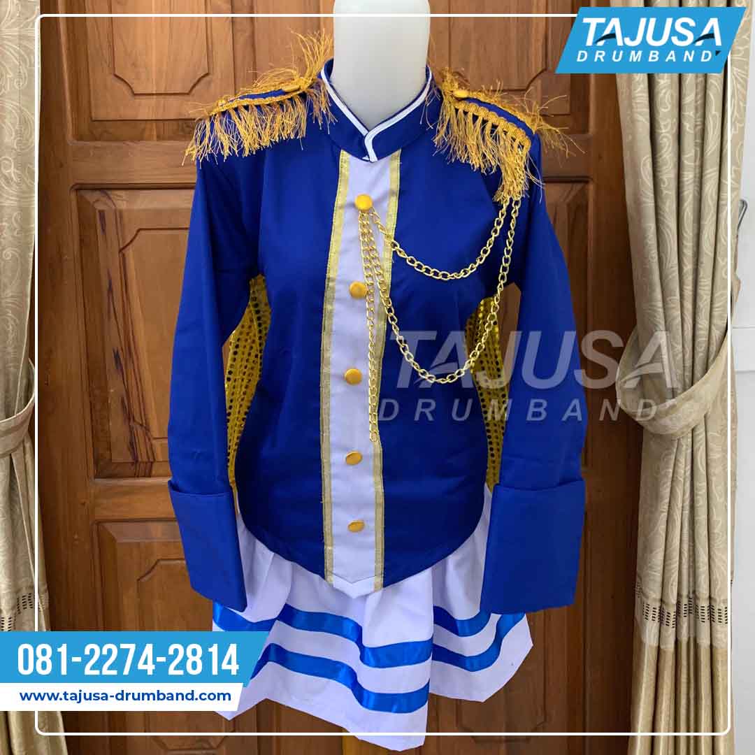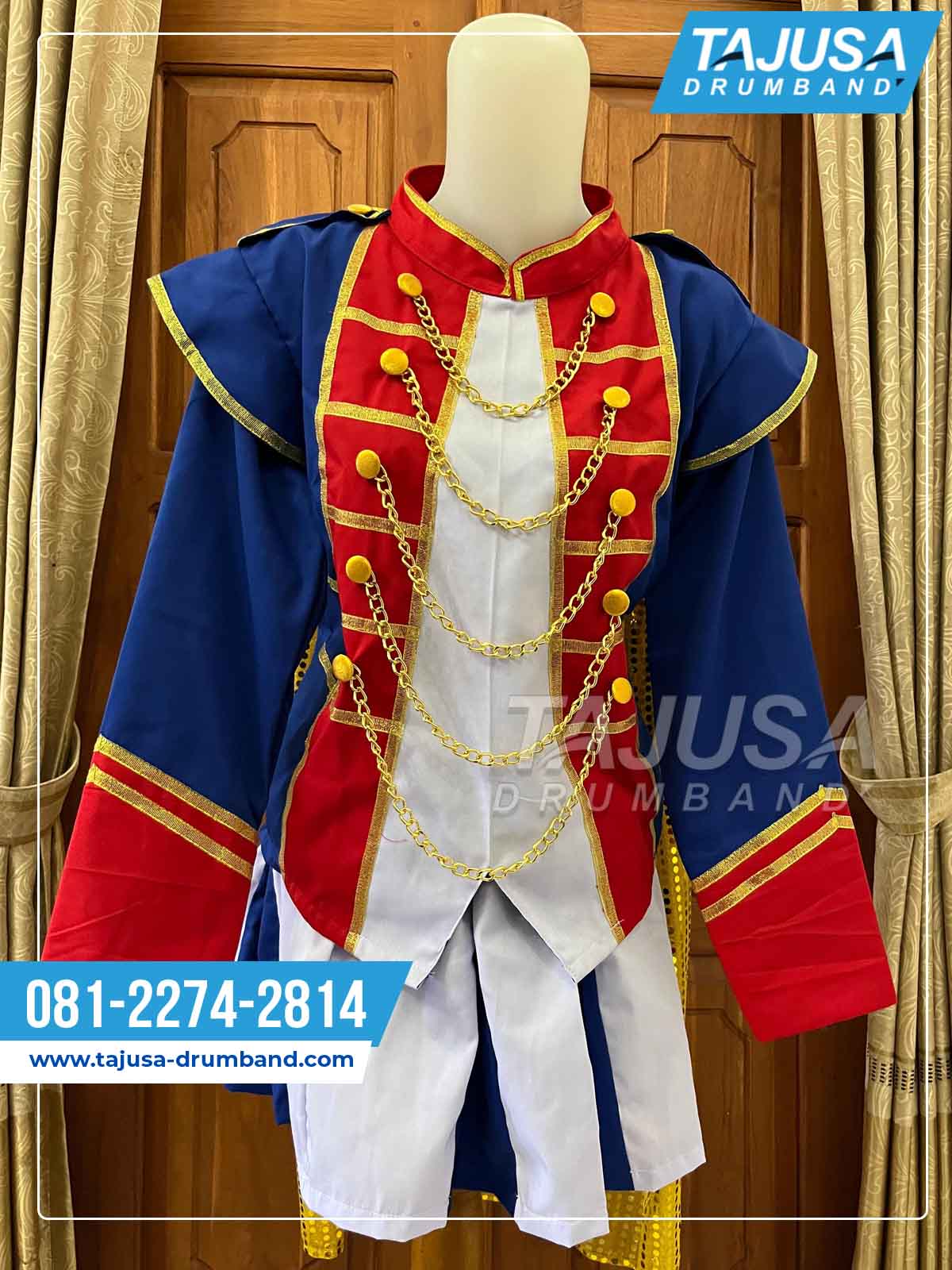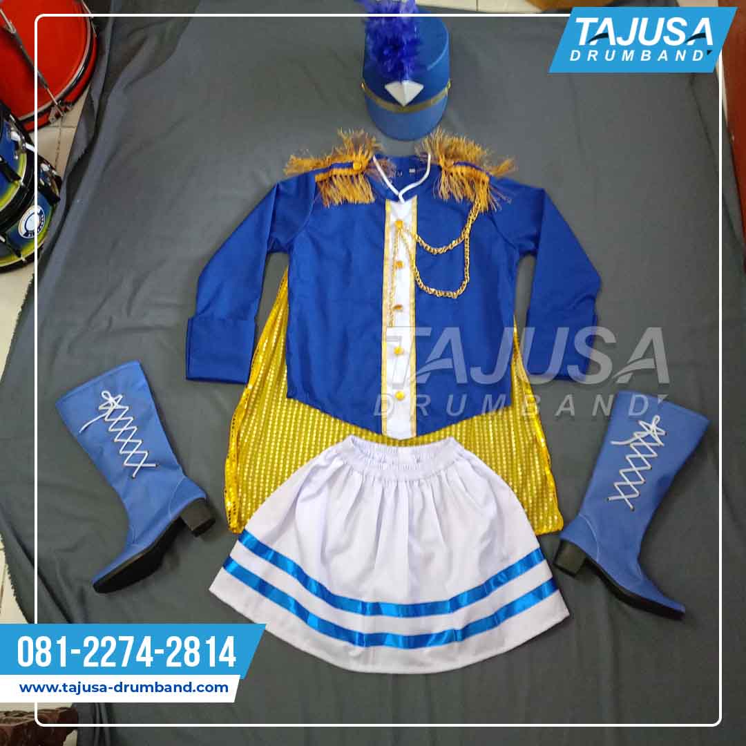 Seragam drumband ini hadir dengan perpaduan warna biru, putih, dan aksen emas yang elegan. Bagian atasan didesain dengan detail kancing emas, rantai hias, serta rumbai di bahu yang memberikan kesan gagah dan mewah. Rok putih dengan garis biru menambah keserasian penampilan, sementara sepatu boots biru serta topi bulu senada melengkapi keseluruhan kostum.
