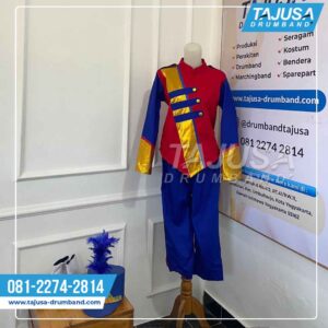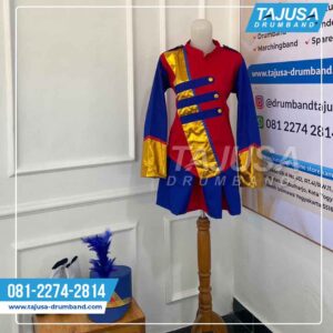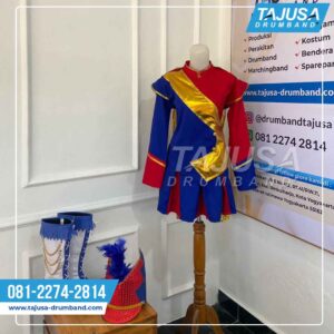 Mayoret selalu menjadi pusat perhatian dalam parade drumband. Kostum mayoret tampil lebih mewah untuk menonjolkan peran pemimpin barisan. Warna merah, biru, dan emas berpadu dalam potongan unik dengan aksen diagonal. Tambahan ornamen dekoratif memperkuat tampilan elegan.