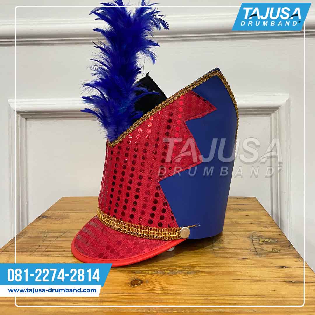 Mayoret selalu menjadi pusat perhatian dalam parade drumband. Kostum mayoret tampil lebih mewah untuk menonjolkan peran pemimpin barisan. Warna merah, biru, dan emas berpadu dalam potongan unik dengan aksen diagonal. Tambahan ornamen dekoratif memperkuat tampilan elegan.