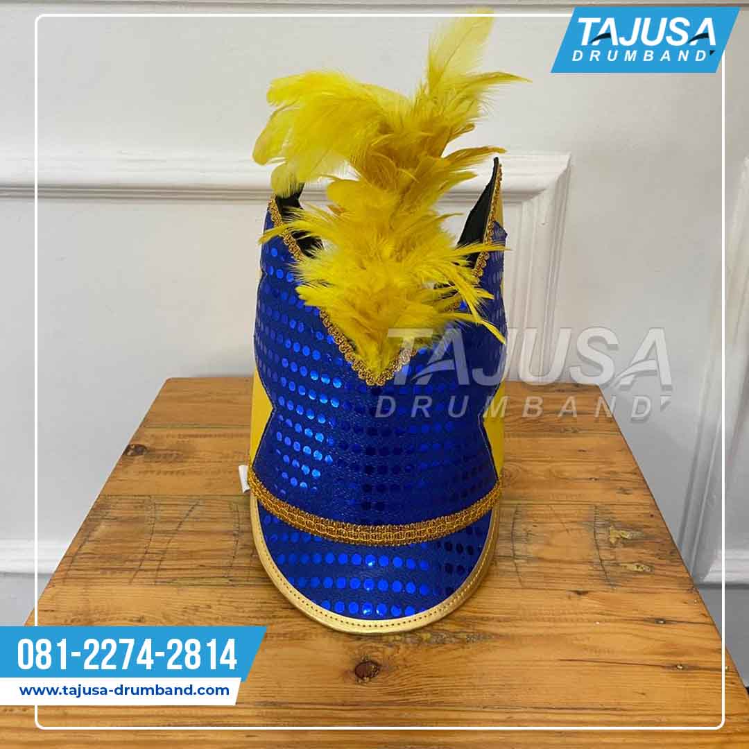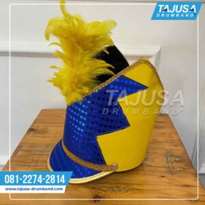 Topi mayoret biasanya memiliki ukuran lebih tinggi dengan tambahan hiasan bulu besar atau payet berkilau. Dalam contoh foto, topi biru dengan bulu kuning mencolok dan aksen emas memberikan kesan glamor dan elegan. Warna-warna cerah ini bukan hanya menarik mata, tetapi juga menegaskan posisi mayoret sebagai simbol kekuatan dan semangat tim.