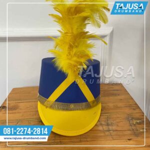 Topi pasukan adalah bagian penting dari tampilan utama barisan drumband. Bentuknya tegak, kokoh, dan simetris, melambangkan disiplin dan kebersamaan. Dalam contoh foto, terlihat topi pasukan dengan perpaduan warna biru dan kuning, lengkap dengan bulu kuning di bagian atas. Warna biru menggambarkan ketenangan dan ketegasan, sedangkan kuning memberi nuansa semangat dan keceriaan.